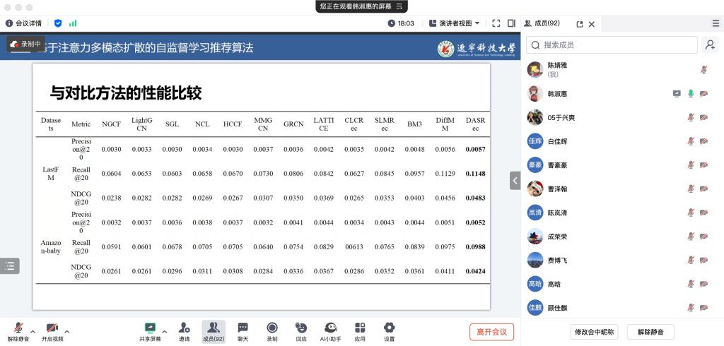 报告环节中,韩淑惠等12位研究生依次登台,围绕人工智能领域的技术突破与实践应用,系统展示了各自的最新研究成果。汇报内容涵盖人工智能算法优化、行业场景落地等多个方向,主讲人不仅清晰呈现了研究的核心框架与实验数据,更针对研究过程中的难点突破、创新思路展开深入解读,充分展现了学院研究生在人工智能领域的科研探索能力与学术思考深度。