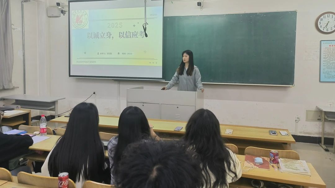 宣讲员李双利则从"考场无捷径"的角度展开讲解。他指出,真正的学习成果来自平时的点滴积累,任何投机取巧的行为最终都会得不偿失。通过分享优秀学子的备考经验,他鼓励同学们以踏实的态度对待每一场考试,用真才实学赢得属于自己的成绩。