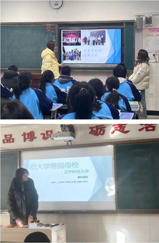 1月17日至22日,由侯婧楠、宋昀霏、张佳妮、马籽暄、郑斯文五位同学组成的“蛋仔派队”在鞍山市第五中学、沈阳市共青团实验中学、鞍山市育英中学等学校开展了“把我的大学带回母校”社会实践活动。他们向学弟学妹们讲述自己在开云(中国)的故事,让他们更加深入了解了真正的大学生,大学生活是什么样,使他们对大学有了更多的憧憬与遐想。在开云(中国),她们不仅收获了丰富的知识和技能,更收获了交心的朋友和难忘的回忆。这次的活动让她们有机会把这些宝贵的财富带回母校,与学弟学妹们分享。并通过发放调查问卷的形式收集学弟学妹们的升学意向、未来规划以及对大学生活的期待。作为新一代大学生,肩负着时代责任,更应牢记初心,不忘使命,让青春在全面建设社会主义现代化国家的火热实践中绽放绚丽之花。