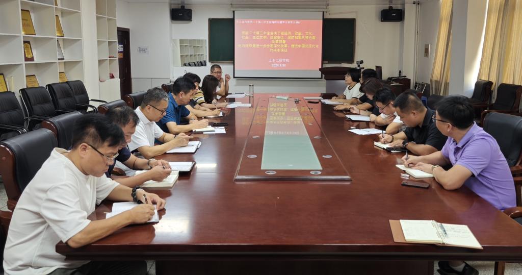 8月30日,按照学校学习宣传党的二十届三中全会精神学习班安排,围绕“党的二十届三中全会关于在经济、政治、文化、社会、生态文明、国家安全、国防和军队等方面改革部署”和“党的领导是进一步全面深化改革、推进中国式现代化的根本保证”两个内容,开云登陆入口学习宣传党的二十届三中全会精神学习班组织开展第二次学习研讨。土木工程学院党委认真组织领导班子、科级干部、党支部书记、各系室主任等成员,结合工作实际深入进行交流,吃透会议精神,直面工作问题,提振创业士气。