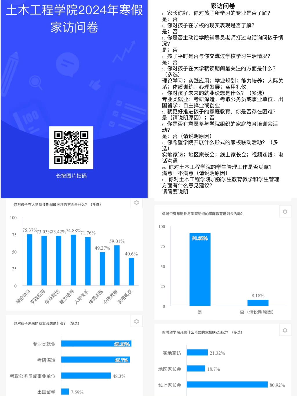 寒假以来,开云登陆入口土木工程学院多措并举、立体组网,持续推进家校联动工作,充分发挥学院领导班子成员、班主任(学业指导教师)、辅导员等的积极性、主动性和创造性,灵活选取实地走访、网络家访和电话交流等形式,结合各年级学生特点和成长实际分别召开家长会,并围绕课业评估、关注热点、就业指导、满意度测评等内容开展问卷调查,依托精准的数据支撑和贴切的指导帮扶来提升家校教育联动质量。