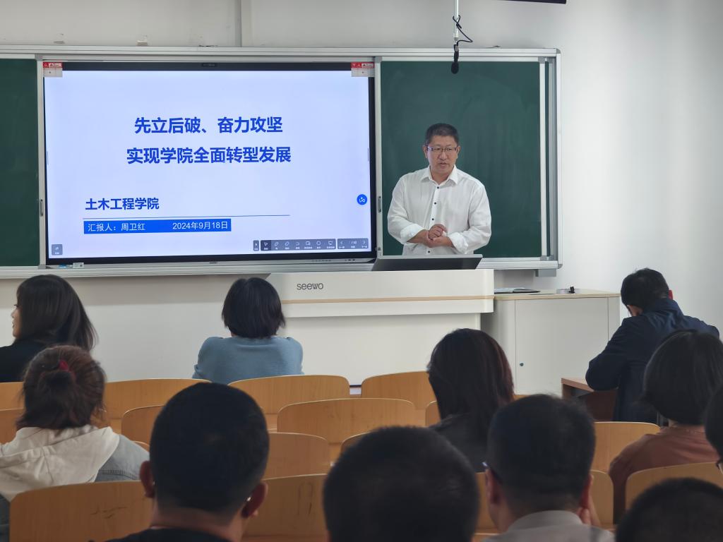 9月18日,土木学院在土木楼A508召开全院大会,布置学院“本科教学质量文化月”、“教师课堂教学大练兵”、期初教学工作例会等工作,进一步明确责任部门、责任人、截止时间等。会议要求全体教师务必按时完成每个阶段任务,务必自检互查到位。院长周卫红总结了上半年重点工作目标完成情况,要求全体师生员工要同心协力,高质量完成学校的重点工作目标和审核评估工作。院党委书记周晓平强调,党建工作与审核评估工作要密切结合,党员要发挥模范带头作用,在各自岗位冲在一线,勇担重任,每位教师要积极工作,自觉遵守职业道德规范和工作纪律,确保各项工作顺利完成。